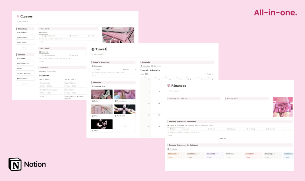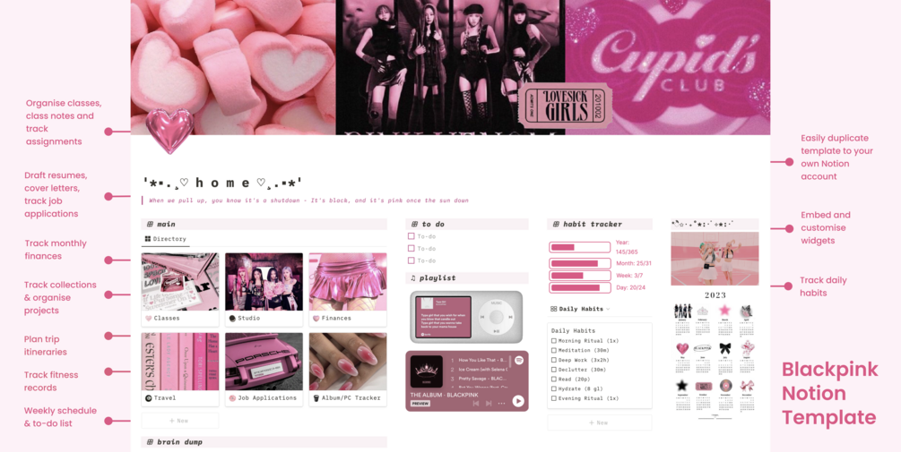 Aesthetic productivity template designed on Notion, inspired by BLACKPINK.