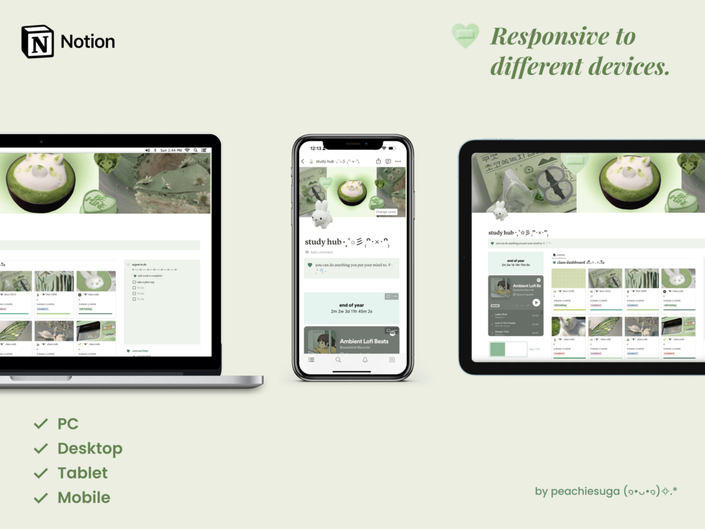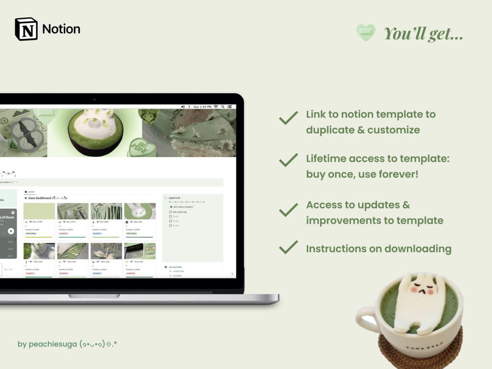 ₊˚⊹♡ Aesthetic & functional matcha green productivity template designed on Notion, for students.