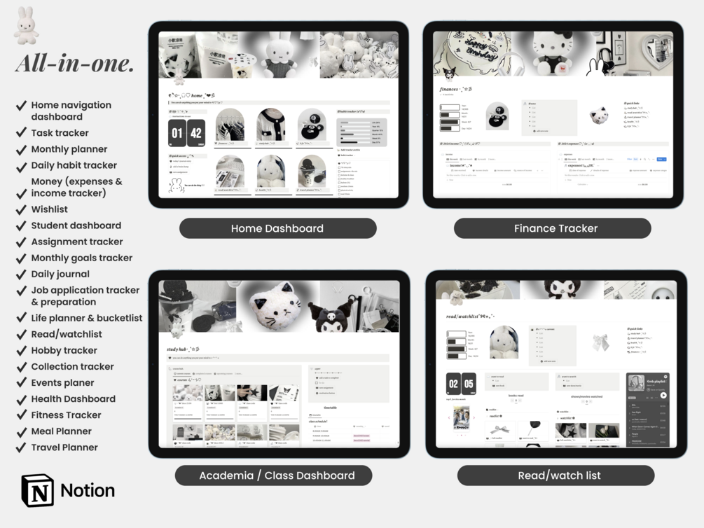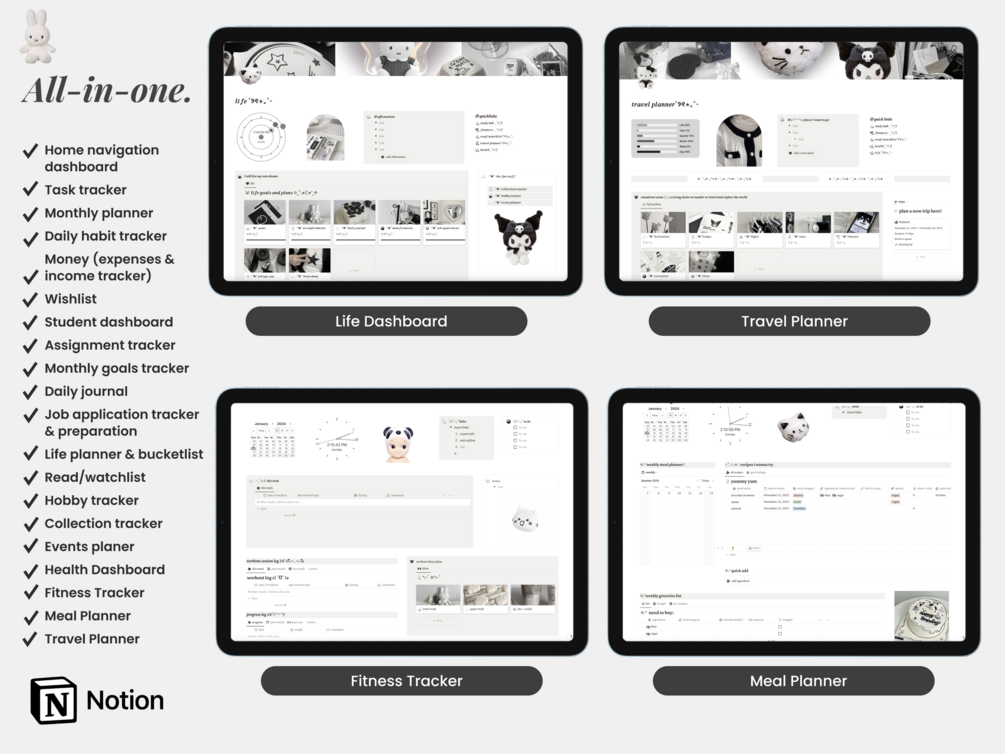 An all-in-one Aesthetic Grey Life Organiser Notion Template
