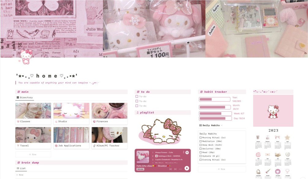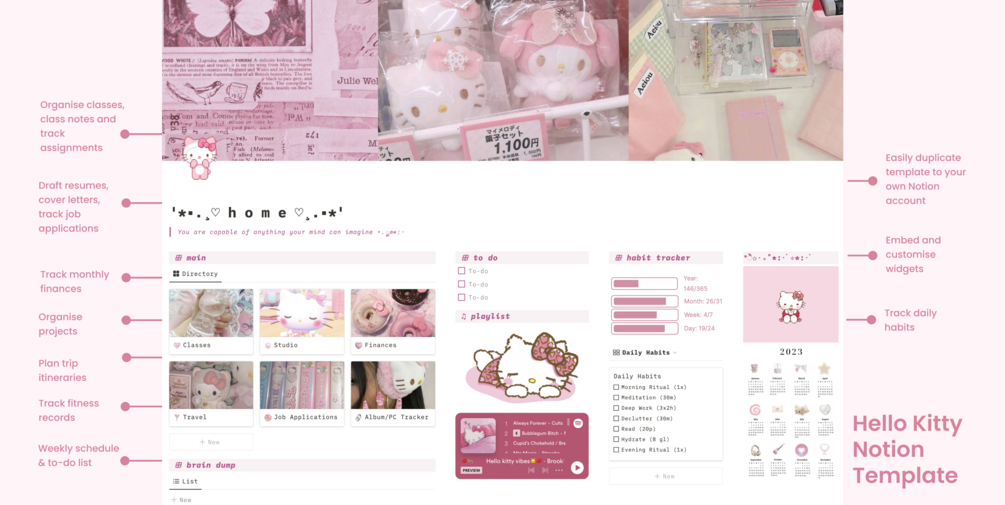 Aesthetic productivity template designed on Notion, inspired by Hello Kitty.